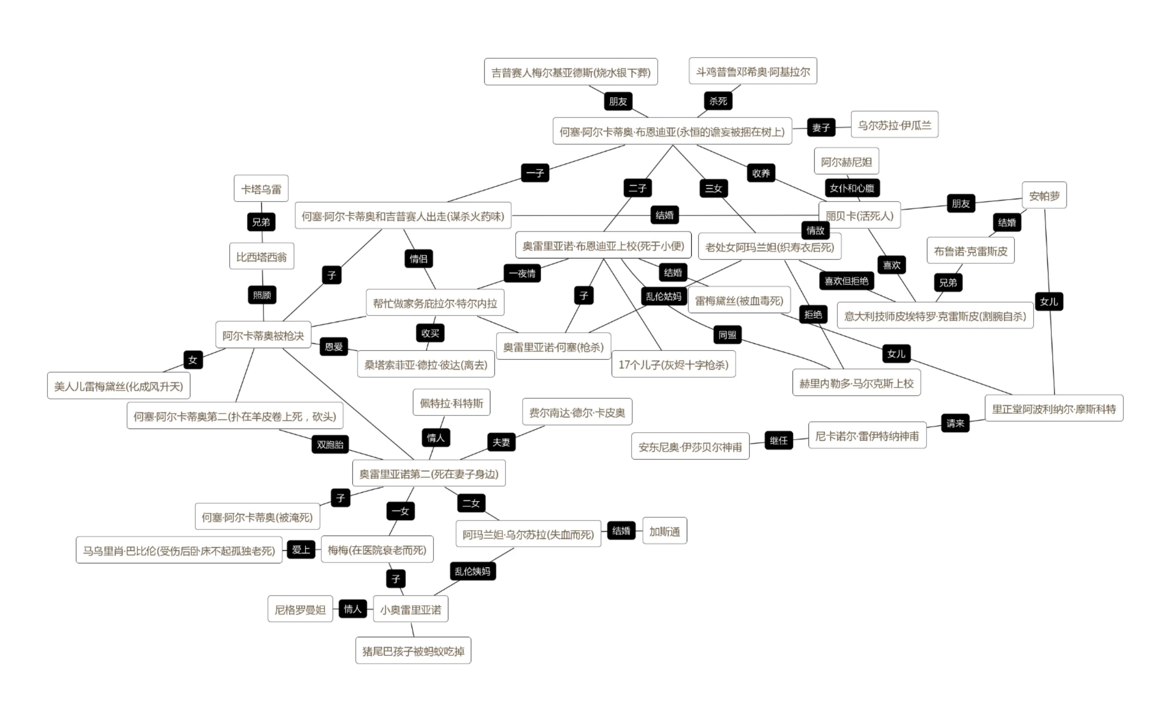 今年把手头的事情大致忙完,空了一天的时间专门用来读书,感觉受益匪浅。一是因为小时候完全没有任何辨认人物关系、世代关系的意识,现在自己做了一个世系表(虽然并不完全,而且还有一些缺漏),而且开始捋一捋马尔克斯埋在书里的一些细节了。