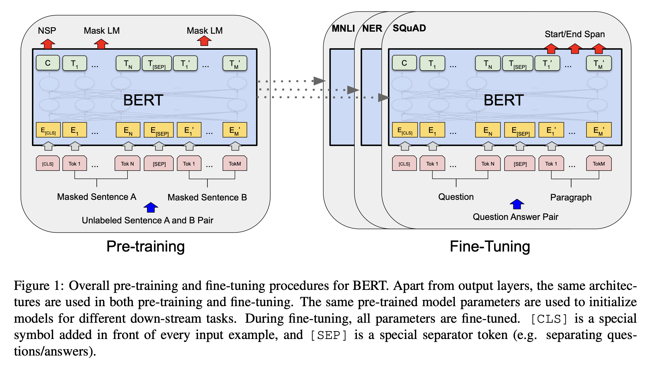 预训练任务 | 无(原始论文中没有预训练概念) | Masked Language Model (MLM) + Next Sentence Prediction (NSP) |