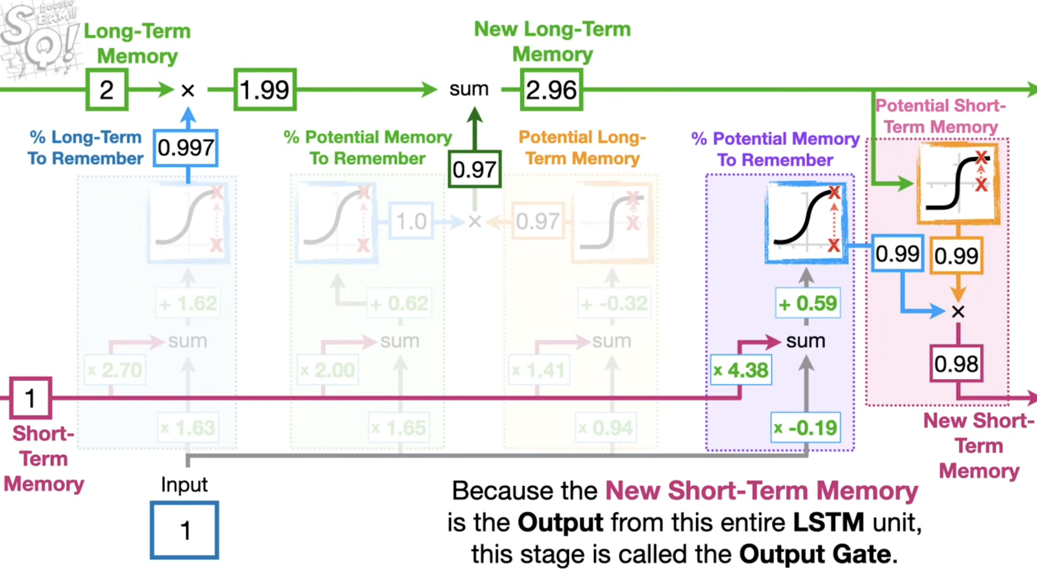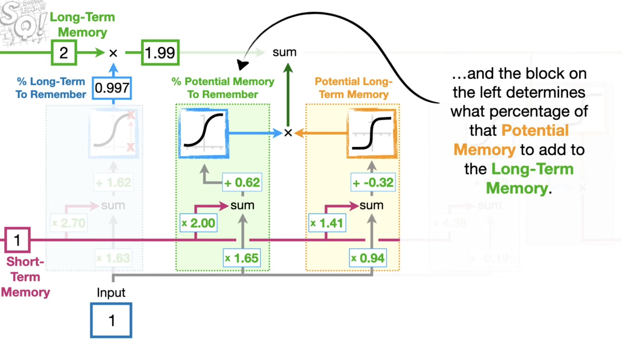 输入门,实质是两部分功能,1. 是记录当前有多少百分比的 Potential Long Term Memory 需要被记住。( At what percentage to saved)2. 决定Potential Long Term memory的数量是多少;通过对这两部分相乘,就能得到更新的Long Term Memory了。
