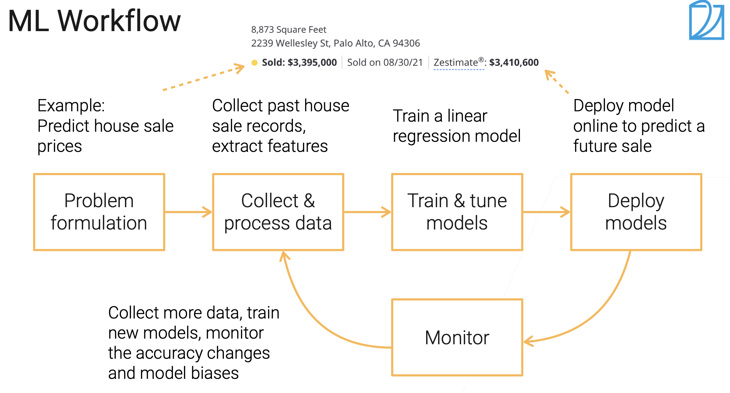 接着去训练模型、调参等;最后可以部署到线上,可真的预测一些东西。部署了之后需要关注模型的性能、预测精度、延迟等。同样部署后会得到新的数据,然后和原先数据融合,再进行训练等。