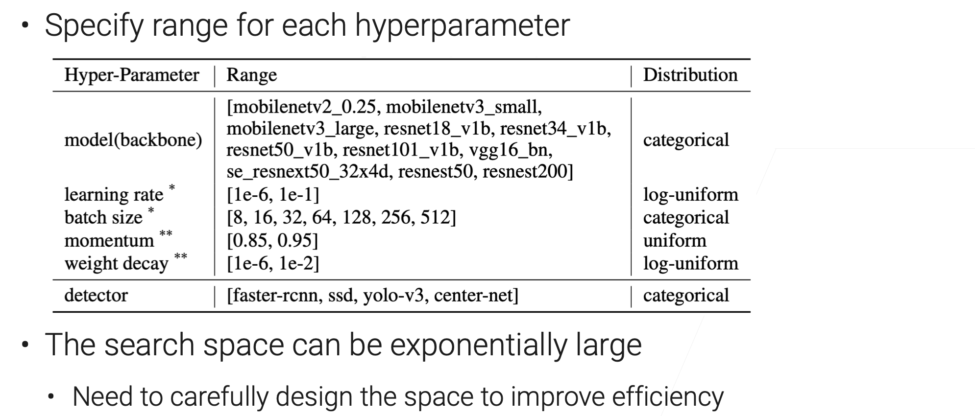 - 从一个好的基线开始(Baseline),一般可以选一些高质量的工具包里的默认数值,也可以看到Paper中的一些值;