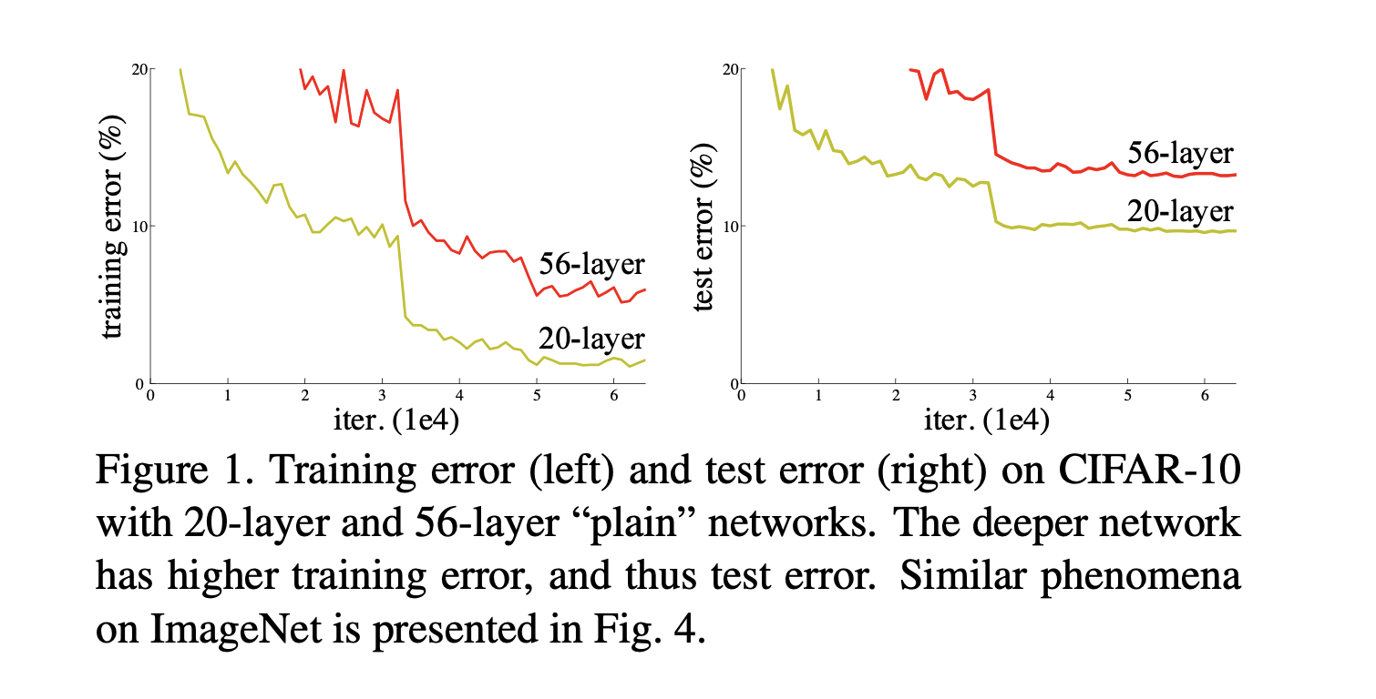 问题:深的神经网络很难训练。并且,一个问题是,深度卷积神经网络,只需要把层堆叠得越来越深就可以了么?可是如果堆叠得很深,那么很容易出现梯度消失和梯度爆炸。在当时,已经有一些缓解方法:Normalization, Initialization。 但是,依然有一个问题:层数多了,性能差了。