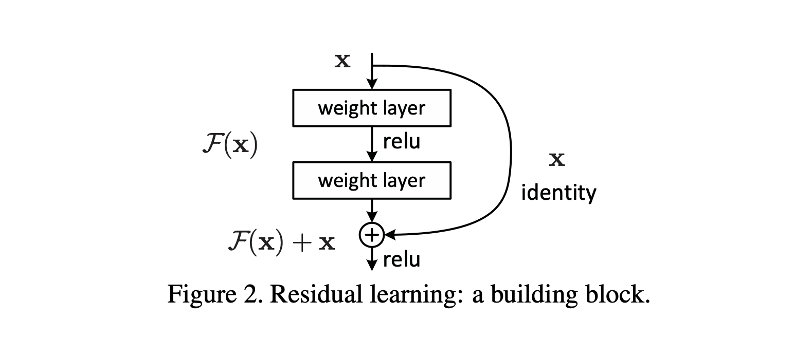 在把神经网络堆叠得更高的时候,每一层学习的时候不只是学习上一层的输入,而是学的 \(H(x) - x\),也就是学习的是残差,在这一层输出的时候,把上一层的 \(x\) (作为 identity )再加上去,最后做 ReLU即可。一个小的 Block 如下图所示。