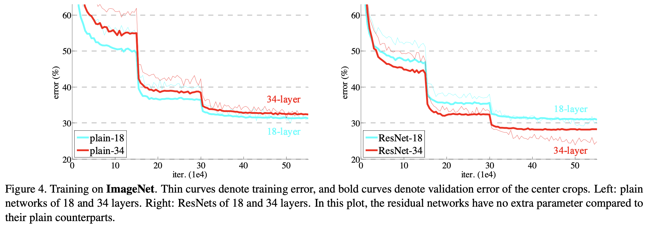中间的突变是学习率下降带来的。可以看到加了 Residual Connection 之后,ResNet 34 的 Error更小了,相比先前提升幅度也更加明显了。