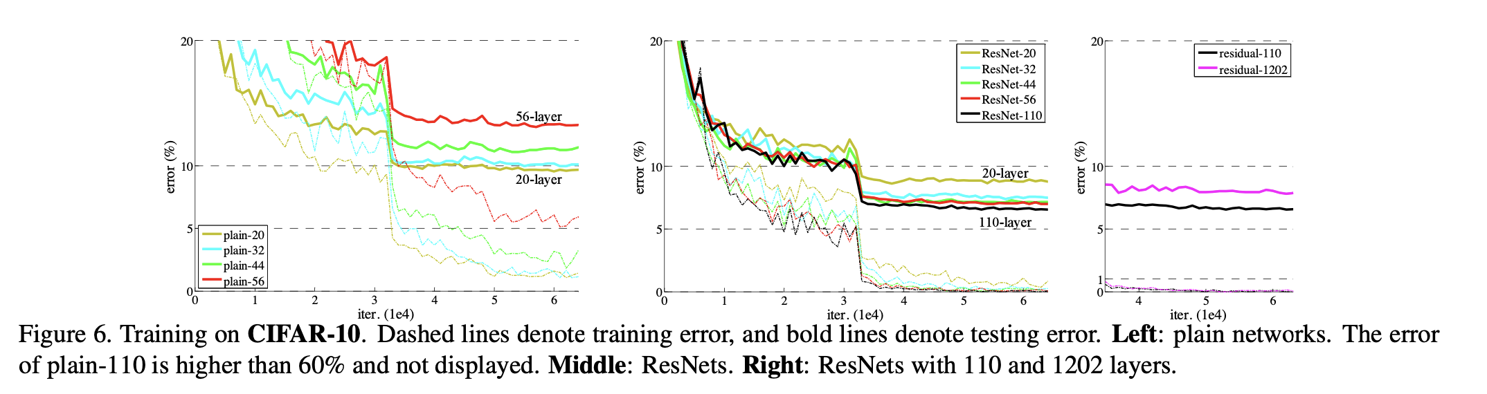 分析:进一步地,作者发现这并不是过拟合导致的。因为训练误差和测试误差都变高了(Overfitting:训练误差很低,测试误差很高)。这意味着,那些深的模型并没有训练到比较好的结果。
