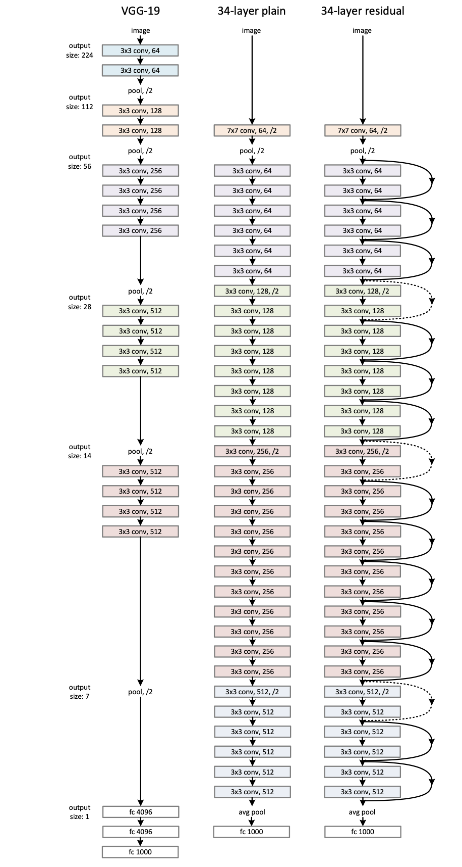 有一些残差连接是虚线,表示做了升维,比如 256 -> 512 Channel 等。
