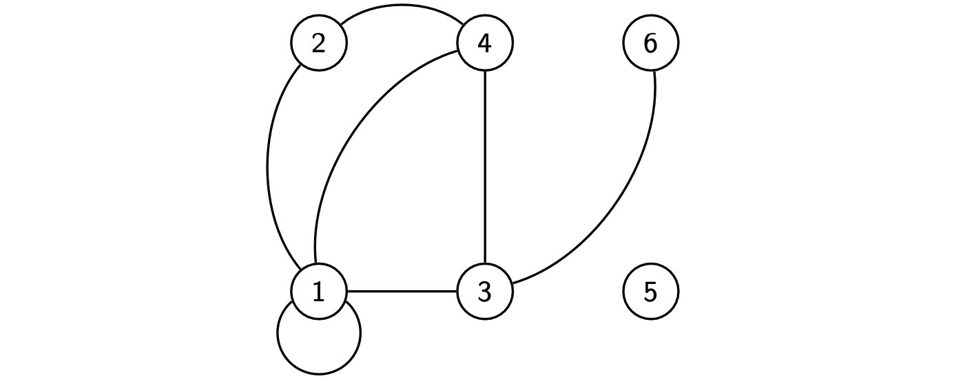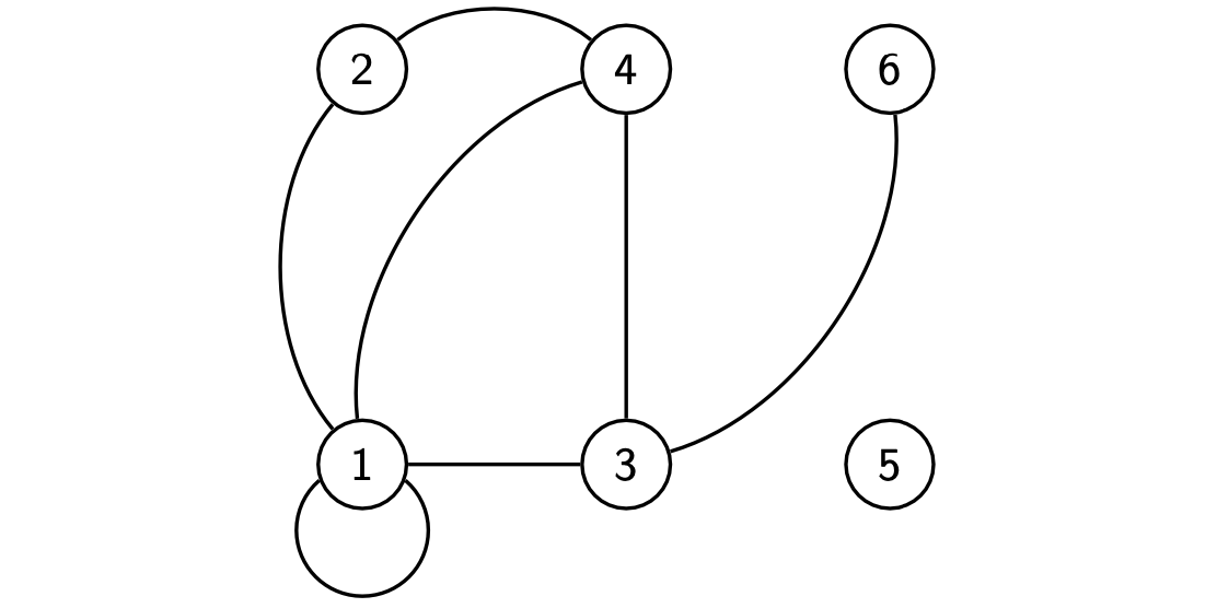 - 示例:\(V = \{1, 2, 3, 4, 5, 6 \}\),\(E = \{\{1, 1 \}, \{1, 2 \}, \{1, 4 \}, \{1, 3 \}, \{2, 4 \}, \{3, 4 \}, \{3, 6 \} \}\)