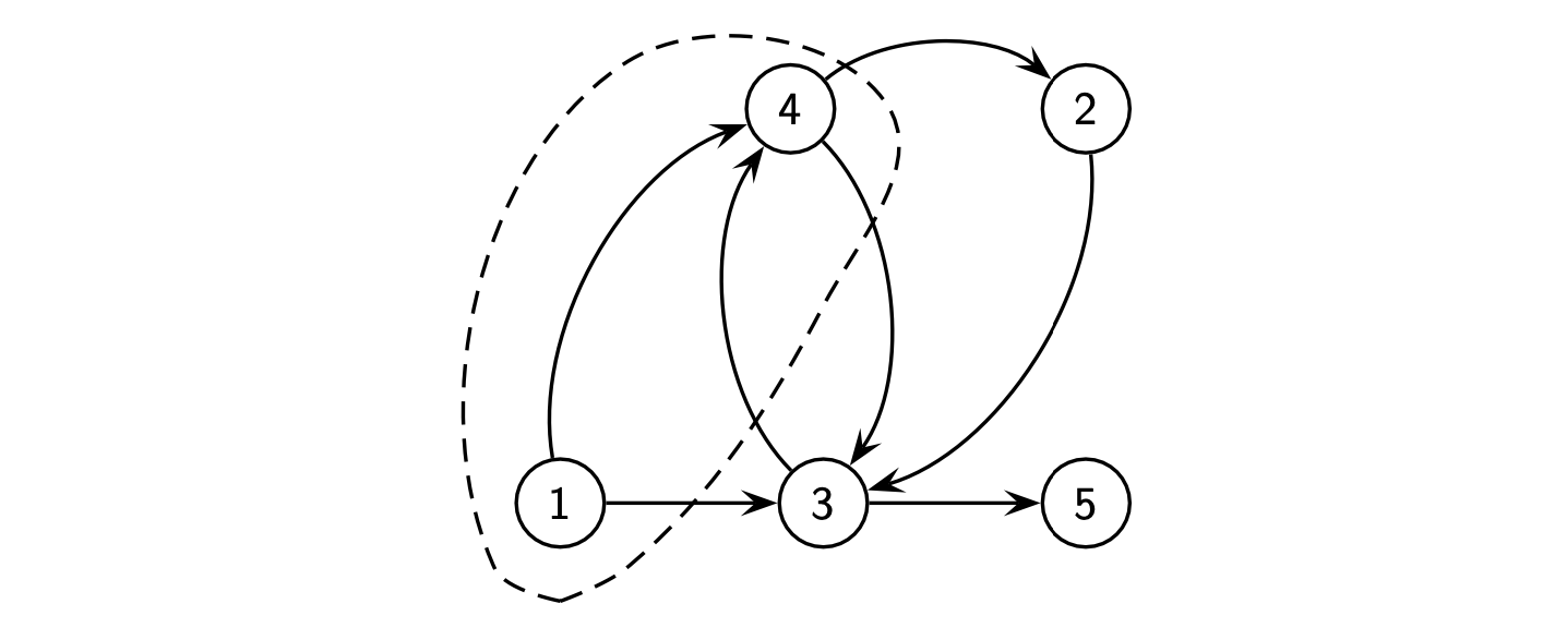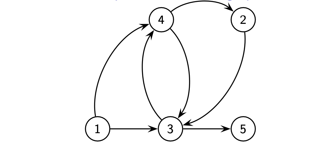 - 示例:\(V = \{1, 2, 3, 4, 5 \}\),\(A = \{(1, 4), (1, 3), (3, 4), (4, 3), (4, 2), (2, 3), (3, 5) \}\)