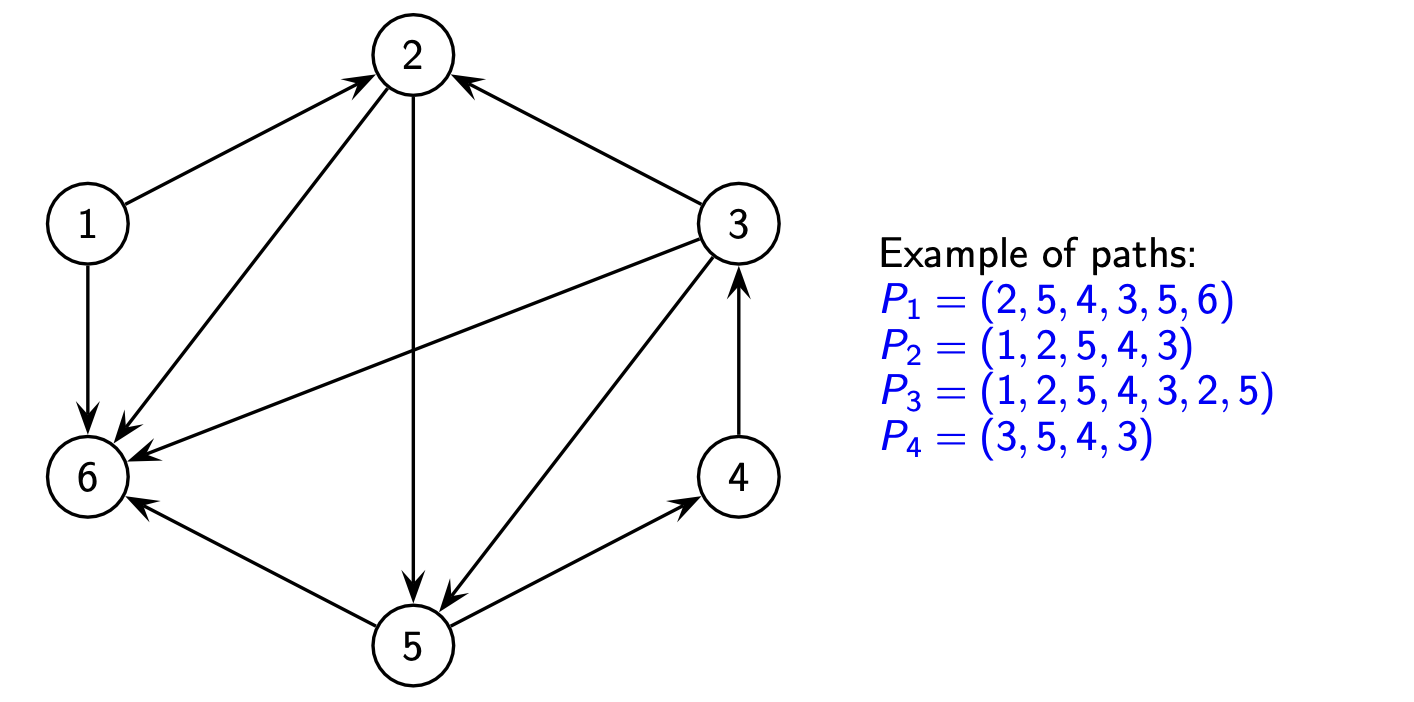 - 弧/边序列:\(P = ((v_{1}, v_{2}), (v_{2}, v_{3}), (v_{3}, v_{4}), \ldots, (v_{k-1}, v_{k}))\)