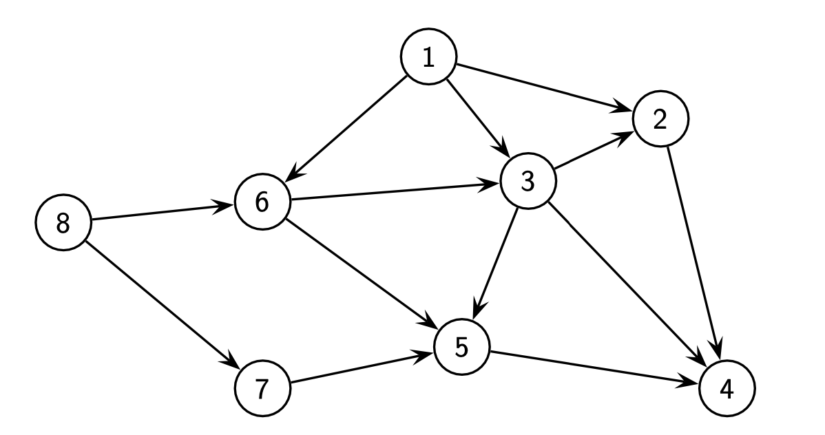 | 有向图 (Directed Graph) | \(G = (V, A)\),其中 \(V = \{1, 2, \ldots, n\}\) 为顶点集;\(A = \{a_1, a_2, \ldots, a_m\}\) 为 \(m\) 条弧 (arcs) 的集合,弧是有序对 \((i, j)\),其中 \(i, j \in V\) | "\(V = \{1, 2, \ldots, n\}\): set of \(n\) vertices (or nodes); \(A = \{a_1, a_2, \ldots, a_m\}\): set of \(m\) arcs, an arc is an ordered pair \((i, j)\), where \(i, j \in V\)" |