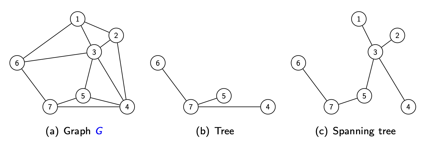 - 生成树 (Spanning Tree):图 \(G\) 的一个部分图,且本身构成一棵树(包含 \(G\) 的所有顶点)