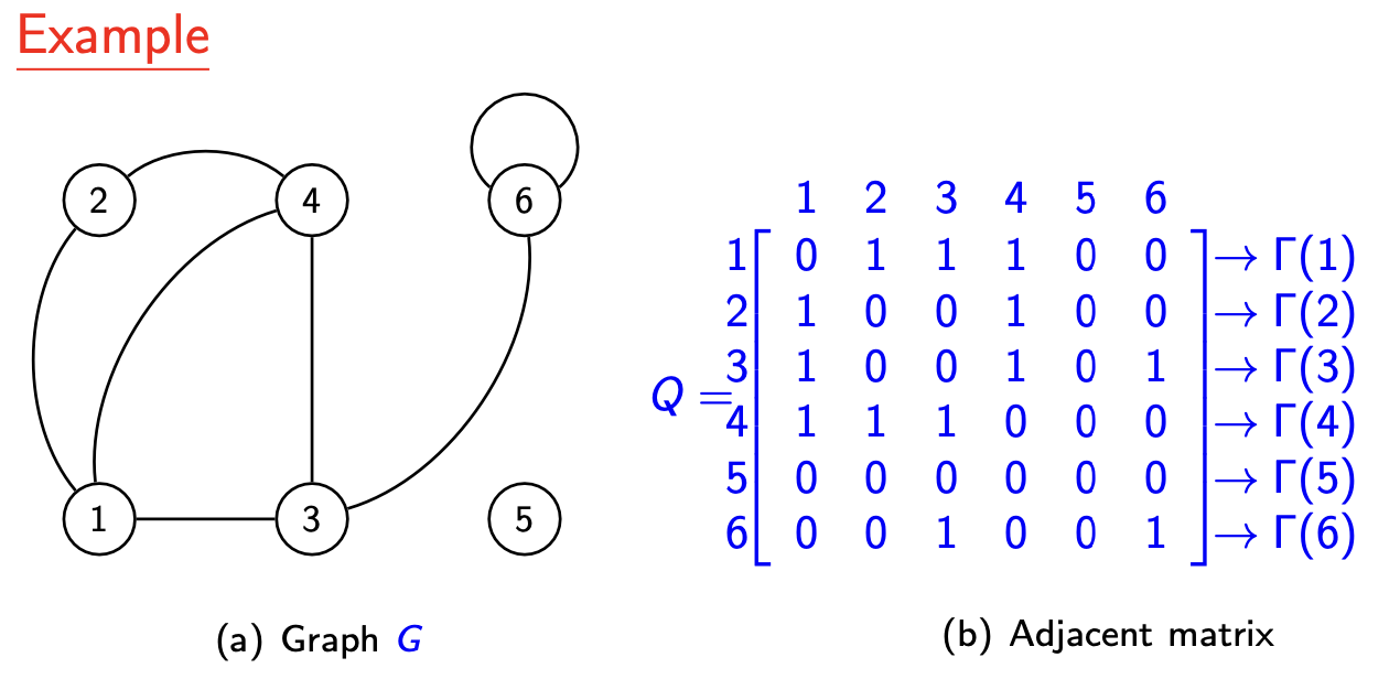 定义:无向图 \(G = (V, E)\) 的邻接矩阵 \(Q\) 是一个 \(|V| \times |V|\) 矩阵,其元素为: