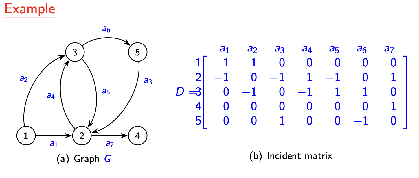- 注意:矩阵中出弧标记为 \(1\),入弧标记为 \(-1\)