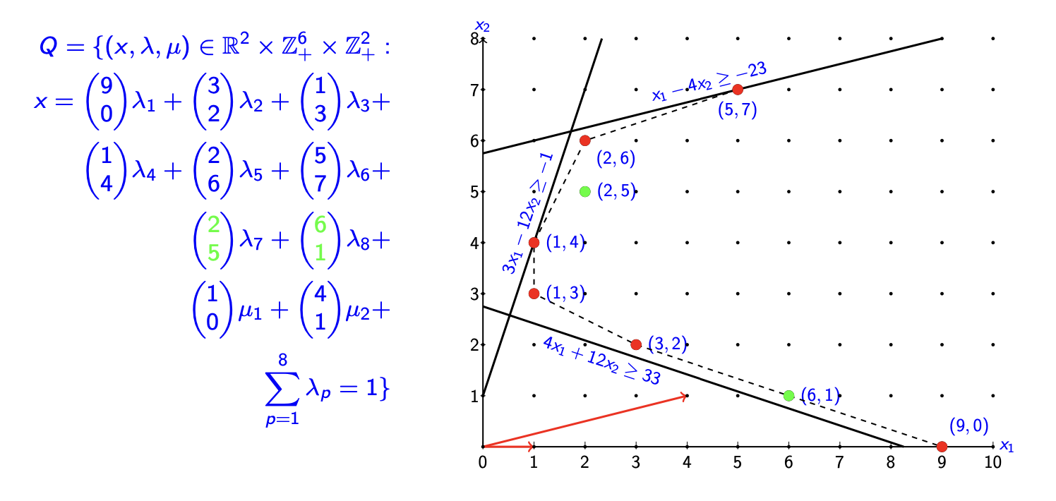 其中 \(X^M = P^M \cap (\mathbb{Z}^n \times \mathbb{R}^p)\),且 \(P^M = \{(x,y) \in \mathbb{R}_+^n \times \mathbb{R}_+^p : Gx + Hy \geq b\}\)。