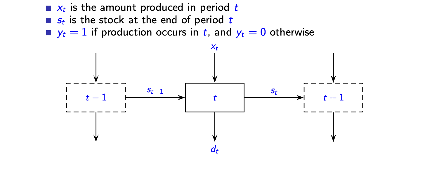 生产 - 库存流转逻辑:第 \(t-1\) 期末库存 \(s_{t-1}\) + 第 \(t\) 期生产量 \(x_t\) = 第 \(t\) 期需求 \(d_t\) + 第 \(t\) 期末库存 \(s_t\)。