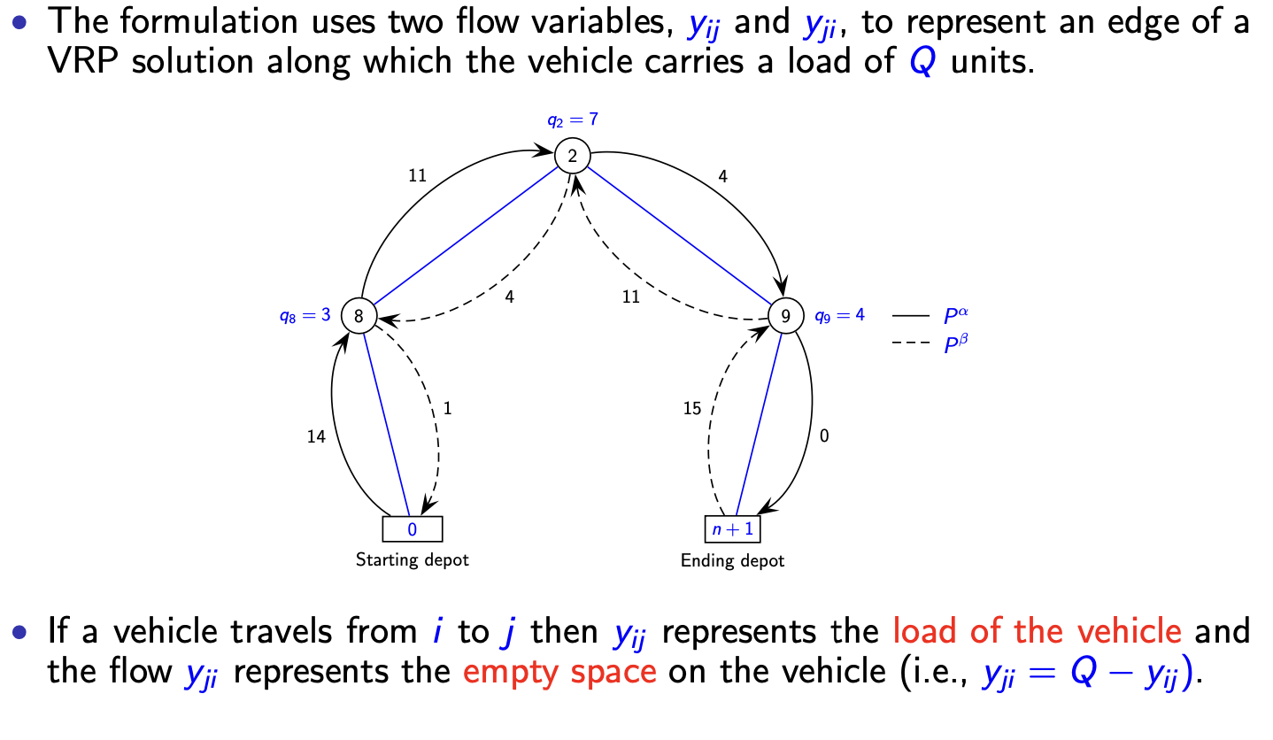 双商品流物理含义:车辆从 \(i\) 到 \(j\) 时,\(y_{ij}\) 为实载流量,\(y_{ji}\) 为空载流量,满足 \(y_{ji}=Q-y_{ij}\);depot 副本 \(n+1\) 用于完整刻画车辆往返流平衡。