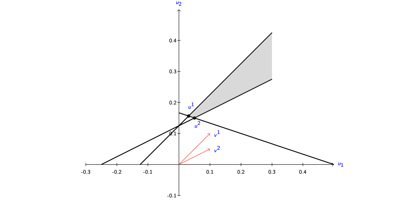 每个多面体 \(P = \{x \in \mathbb{R}^n : Ax \geq a\}\) 可表示为: $$ P = \left{x \in \mathbb{R}^n: x = \sum_{g \in G} \lambda_g x^g + \sum_{r \in R} \mu_r v^r, \sum_{g \in G} \lambda_g = 1, \lambda \in \mathbb{R}+^{|G|}, \mu \in \mathbb{R}+^{|R|} \right} $$ 其中 \(\{x^g\}_{g\in G}\) 是 \(P\) 的极点,\(\{v^r\}_{r\in R}\) 是 \(P\) 的极射线。