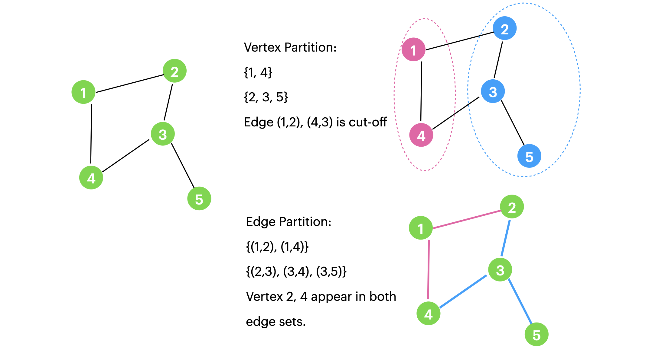 有两种主要的图划分(Graph Partition)场景。第一个,点分割(Vertex Partition);第二个,边分割(Edge Partition)。