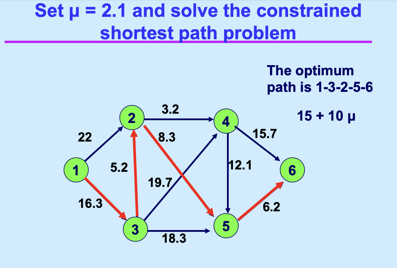 课件通过 \(T=14\) 的 CSP 案例演示了上述流程: * 起步:从两条路径 \(\{1-2-4-6, 1-3-5-6\}\) 开始迭代。 * 迭代:通过计算不同 \(\mu\) 值下的修正成本,不断发现新路径(如 \(1-3-2-5-6\) 和 \(1-2-5-6\))并加入 \(S\)。 * 结束:直到在 \(\mu=2\) 时找不到能进一步提升下界的新路径,此时 \(L^*=7\),算法锁定最优乘子。