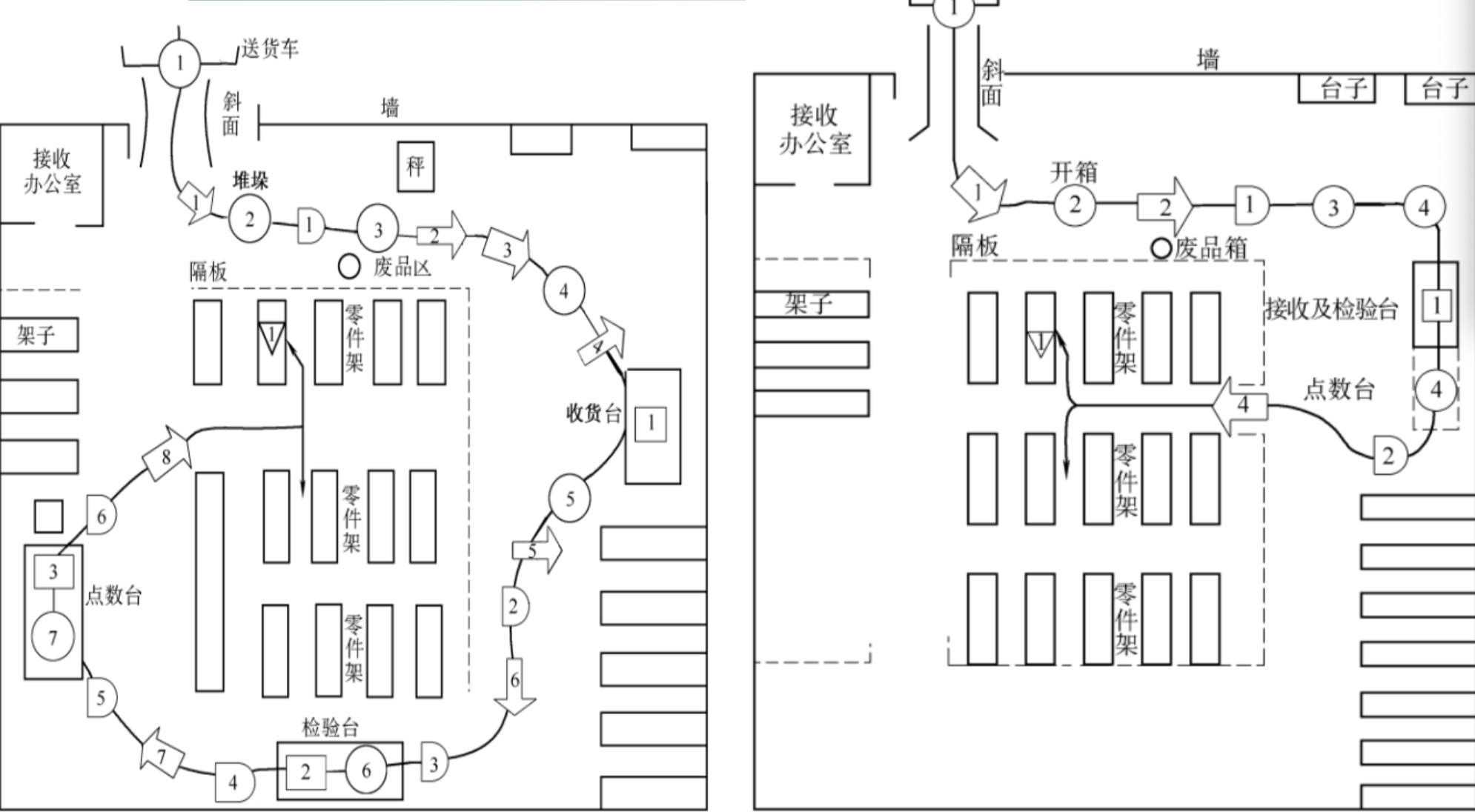 详细分析制造程序,记录搬运、贮存、暂存等动作,包含距离和时间数据。
