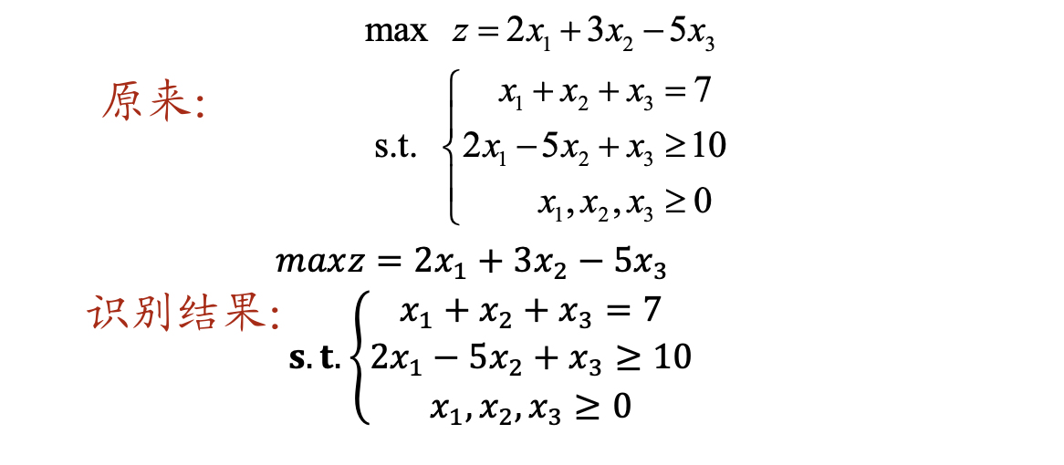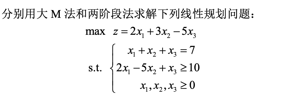 \[\begin{aligned}\max&z=2x_1+3x_2-5x_3\\\mathbf{s.t.}&\begin{cases}x_1+x_2+x_3=7\\2x_1-5x_2+x_3\geq10\\x_1,x_2,x_3\geq0&\end{cases}\end{aligned}\]