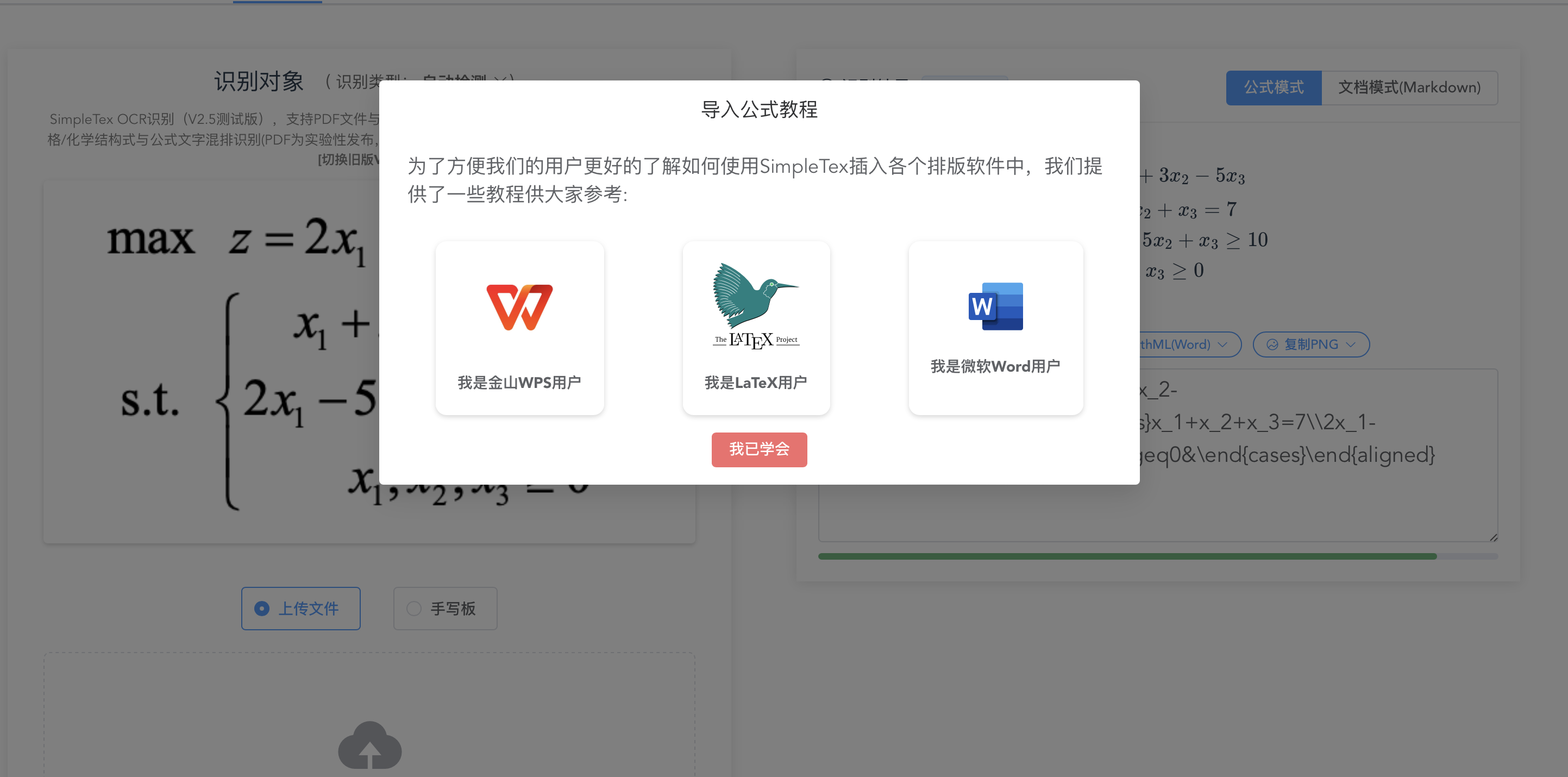可以看到它提供了3种输出方式:WPS,word和LaTeX.点击不同部分会弹出不同的教程: