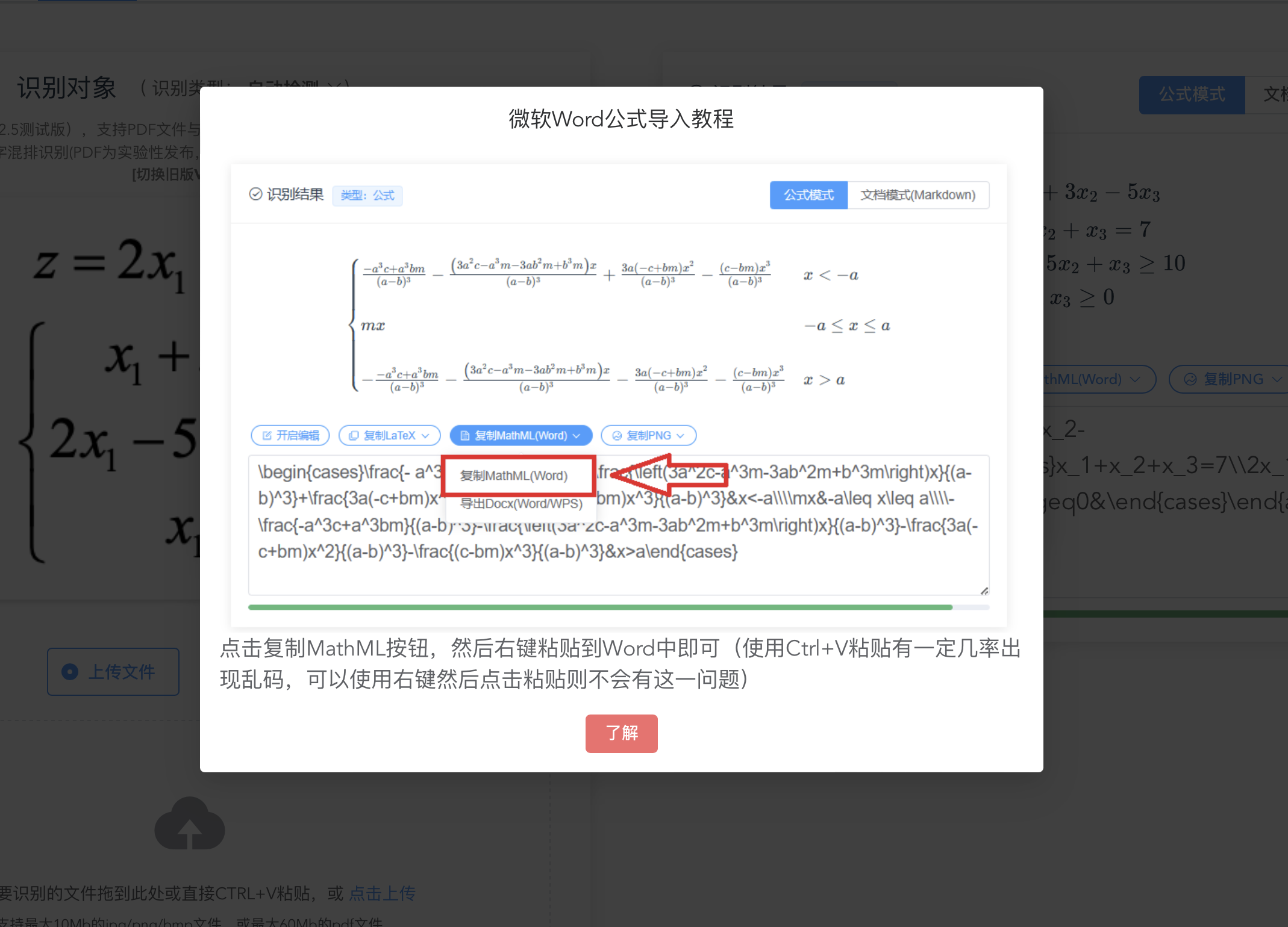你只需要把这个公式截图,放到“在线识别”中(拖动or上传图片),第一次识别它会自动给你弹出教程 (太贴心了!)