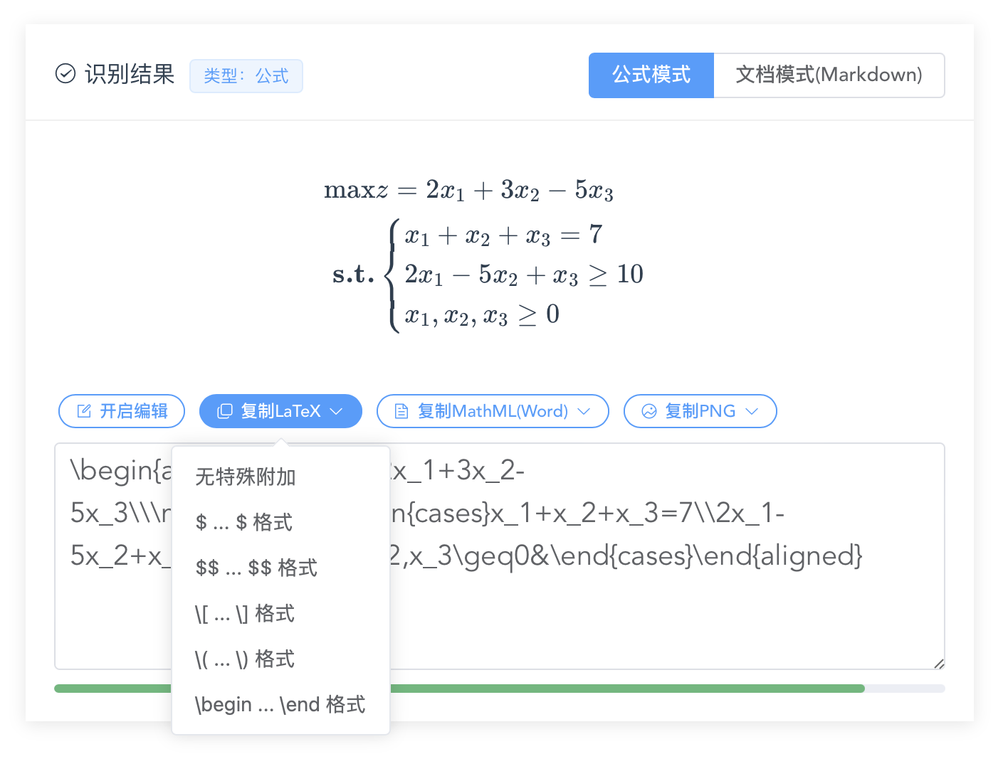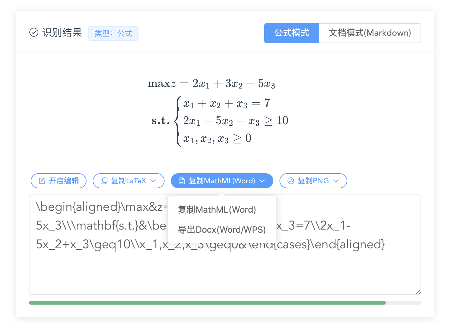 - 支持==多种格式==的导出,比如在word中公式编辑器、Markdown下的LaTeX代码等众多格式,只需复制+粘贴即可