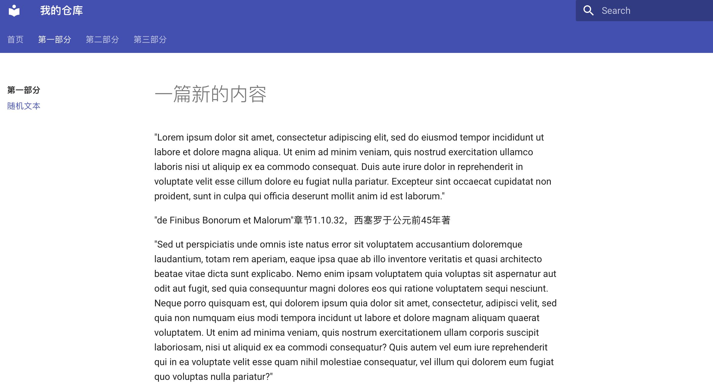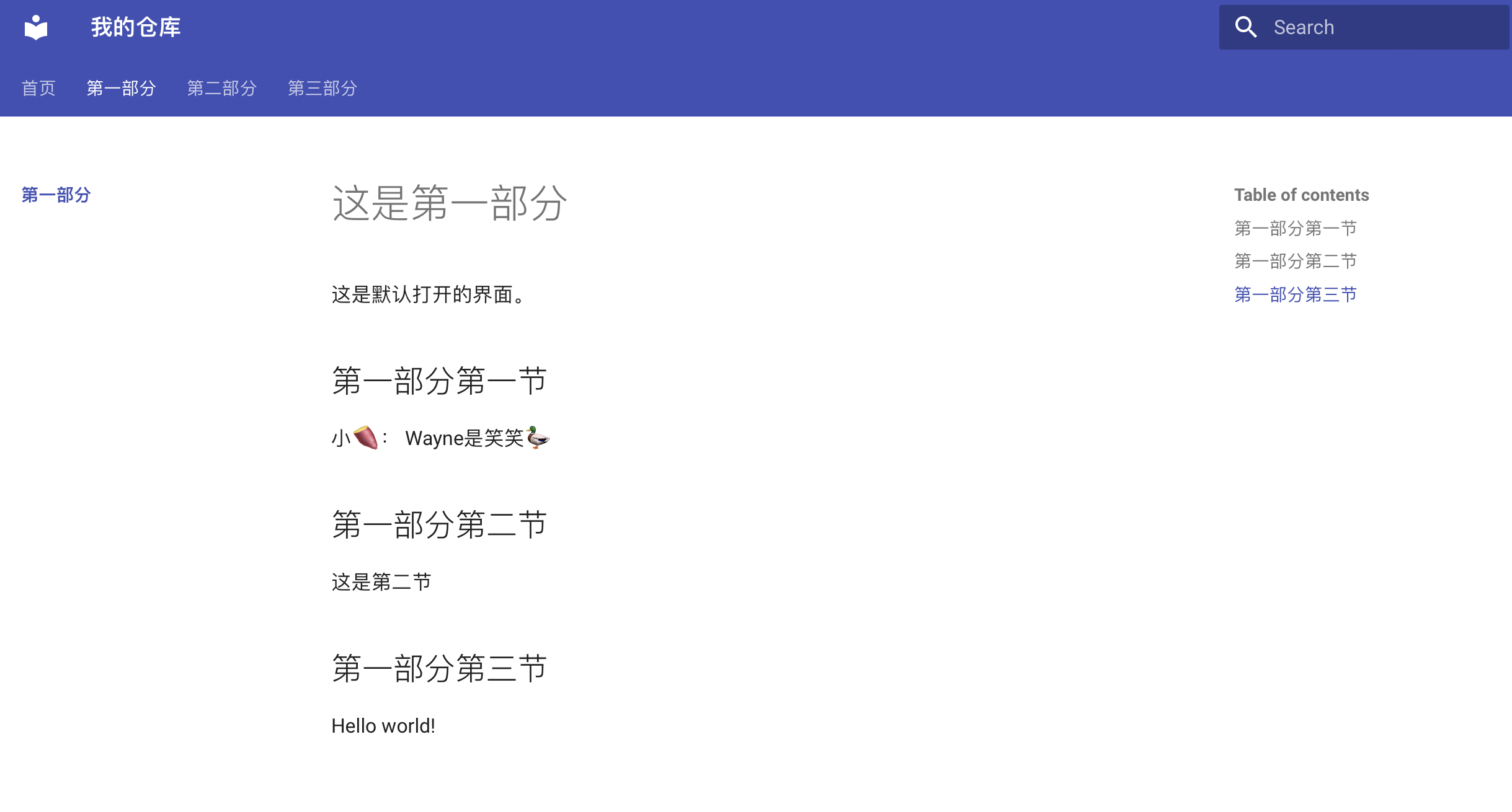 如果我们继续在 docs/Part1/ 文件夹下添加文档,并且将我们的 mkdocs.yml 等的nav 部分添加一条关于新的文档的描述,如下: