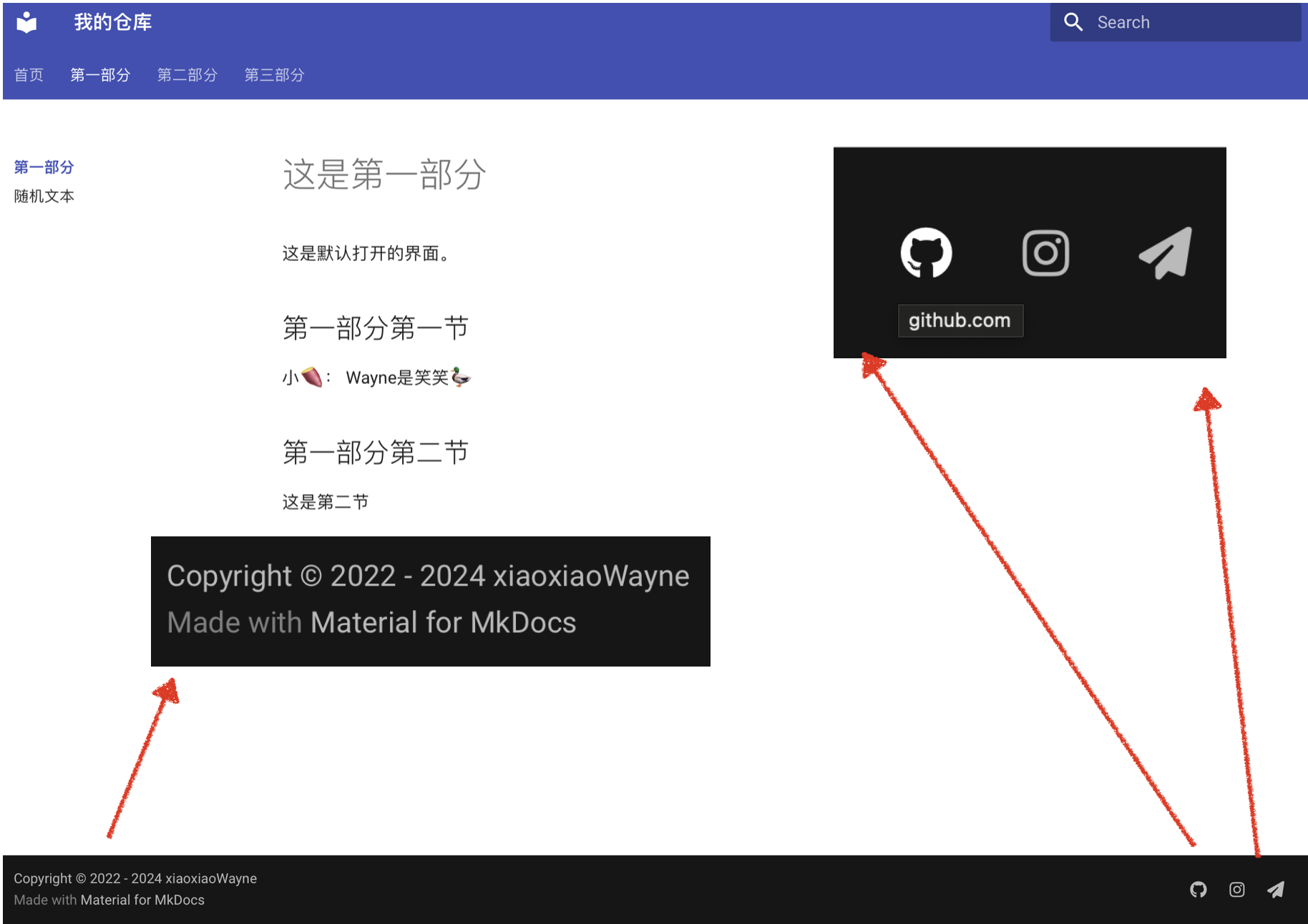 现在我们来修改一些小的细节。比如,我们想要在页脚的位置,添加一些关于自己的链接。比如你是个Ins重度使用者,或者想公开自己的邮箱,你可以在 mkdocs.yml 中添加如下的代码: