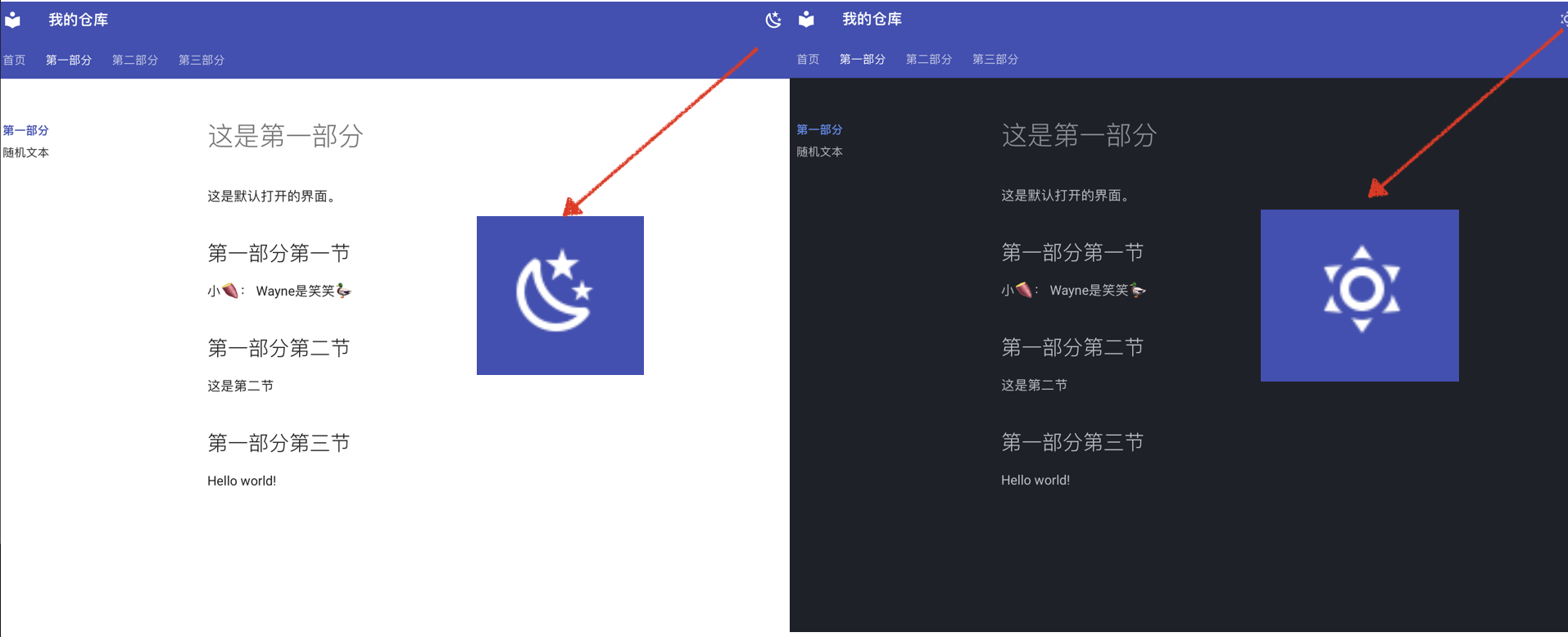 一般网站都支持明暗模式切换,这样在白天和夜晚浏览时能够比较灵活地处理亮度。在Materials中也提供了很简单的增加这个功能的方法。在 mkdocs.yml 中添加如下代码,注意,这里的符号样式也是可以更改的。